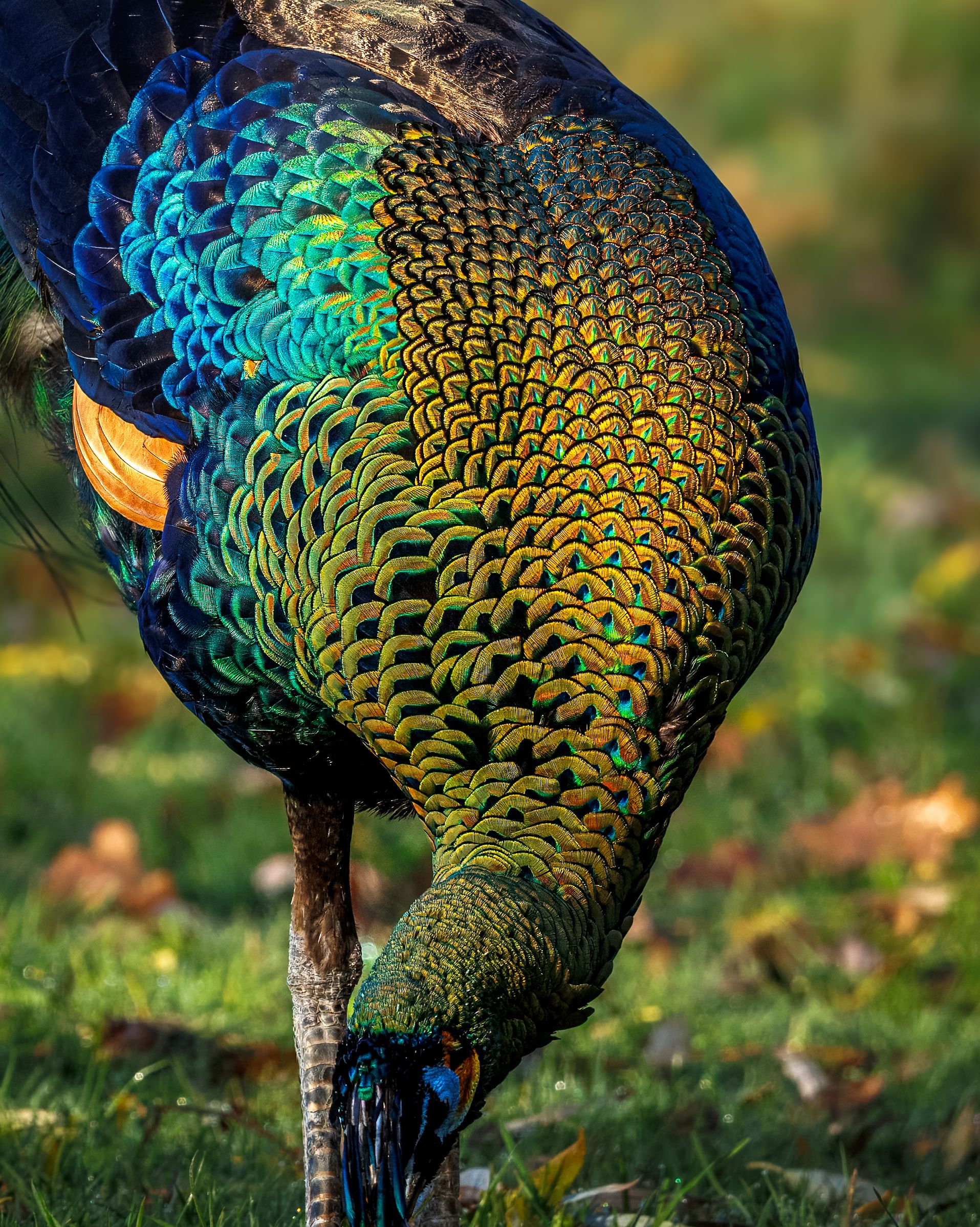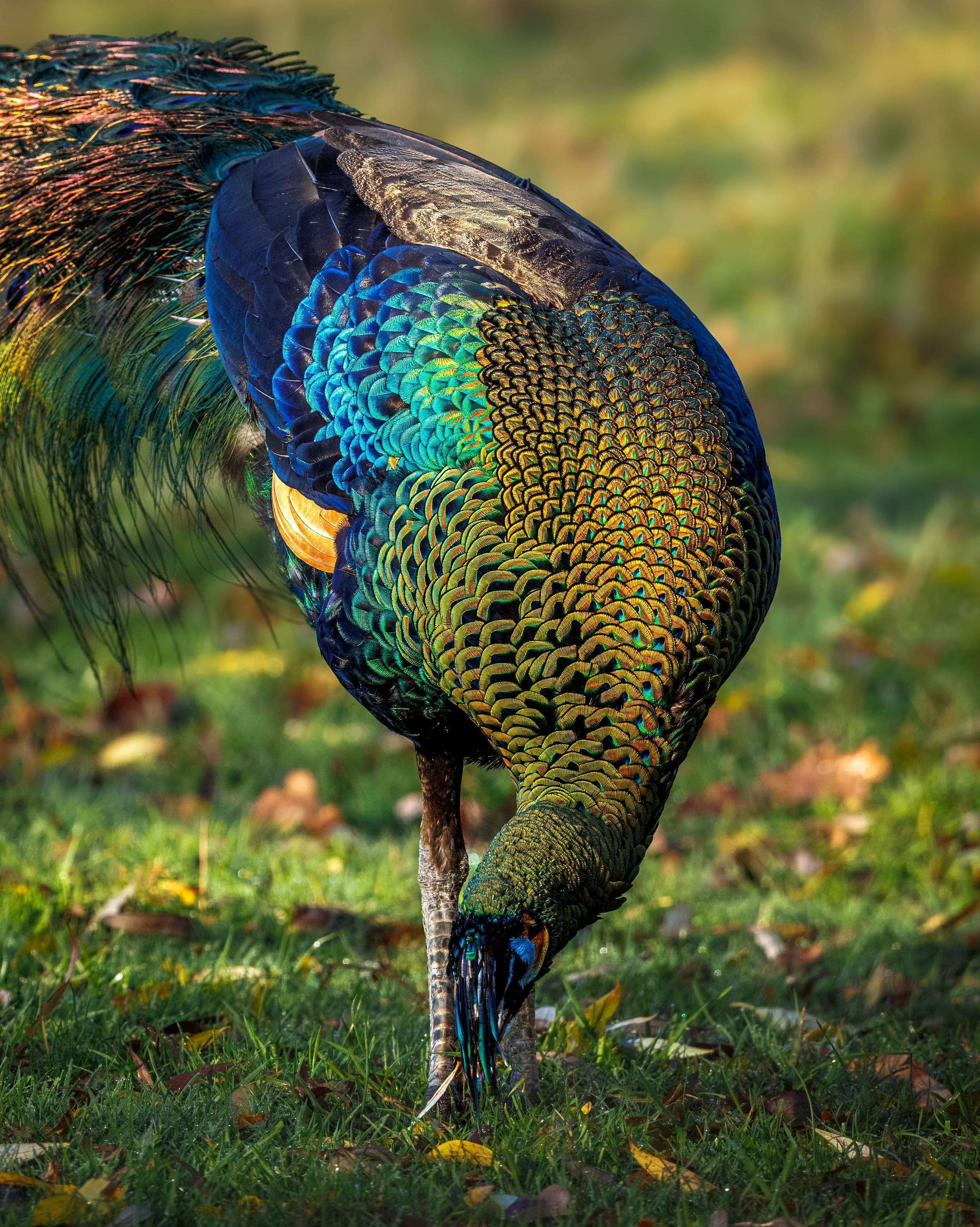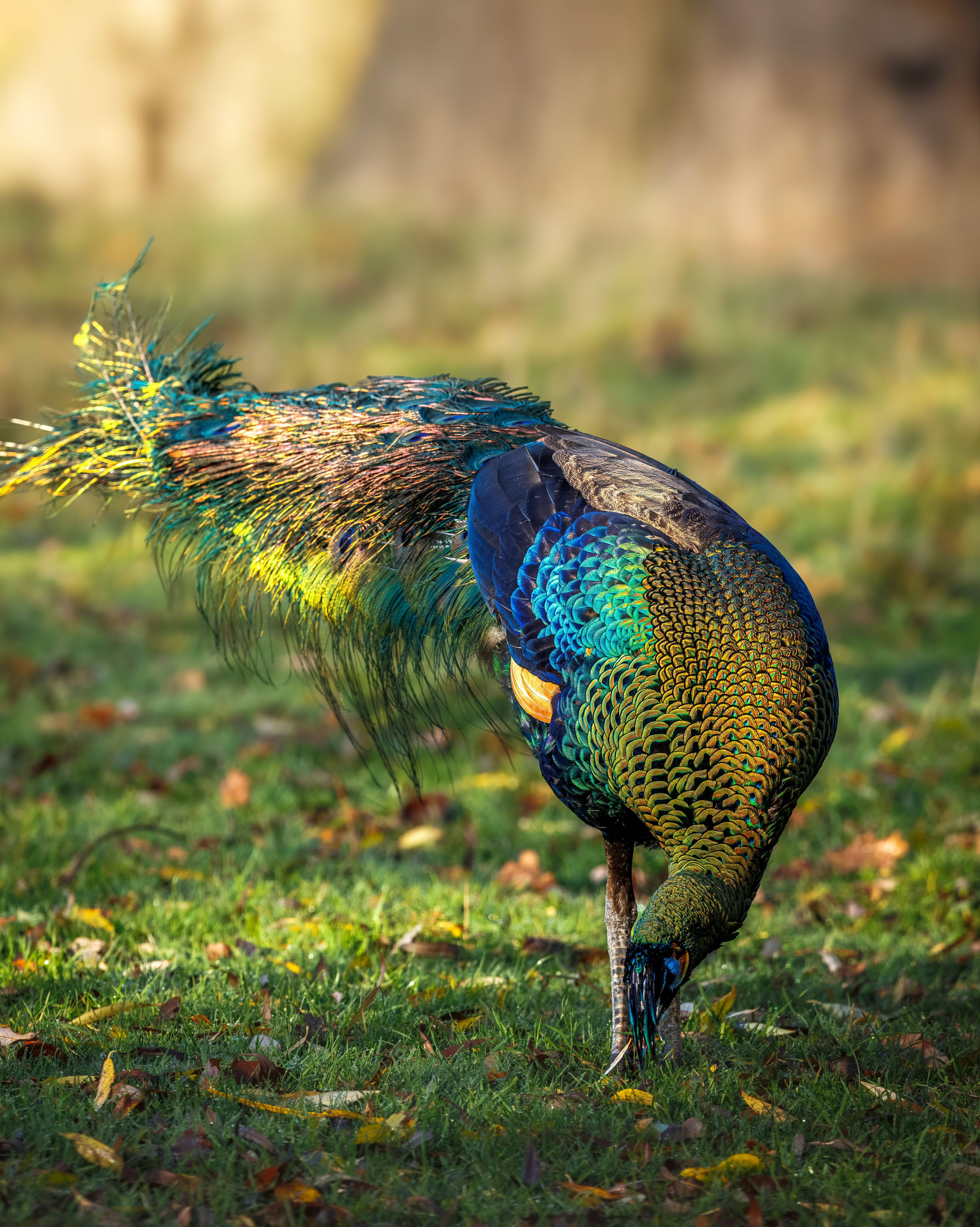 I wanted to make sure I got a sharp well exposed shot as the peacock passed between the sunlight and the long shadows, as it grazed the grasses quickly moving across the paths